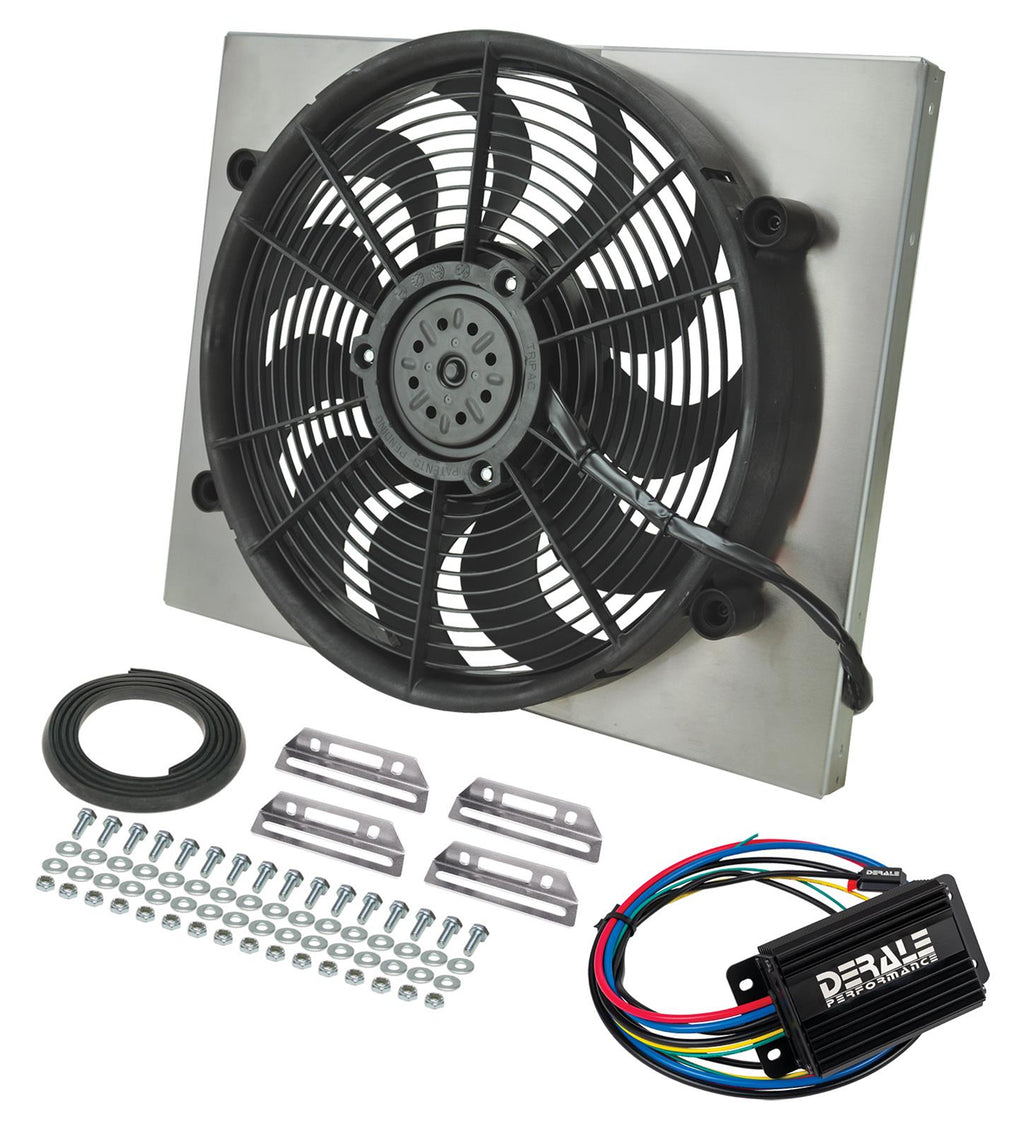 Take control of your engine temperature with one of these Derale high-output RAD fan and shroud powerpacks. They feature a high-output electric fan incorporated into an engineered shroud with an integrated PWM fan controller. The controller utilizes Pulse Width Modulation to constantly adjust electric fan speeds from 0-100 percent, maintaining the optimal engine operating temperature. No more reacting to the engine temps—you can control it! The fan features a powerful 265 watt motor with patented ultra-quiet skewed blade design, and is intended for use as a puller only. Derale Performance high-output RAD fan and shroud powerpacks also include an automatic resetting circuit breaker and built-in air conditioning override circuit.Brand: Derale Cooling Products