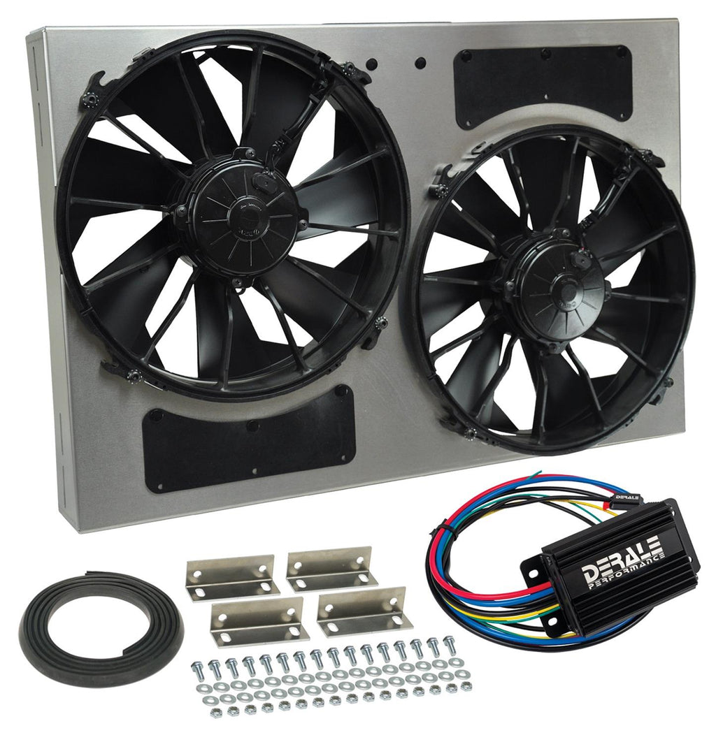 Get complete control of your engine temperature! Derale PWM electric fan Powerpacks have integrated their high-performing PWM fan controllers into the fan units. The PWM fan controller features built-in soft start technology and utilizes pulse width modulation to constantly adjust electric fan speeds from 0-100%. This maintains the optimal engine operating temperature while allowing the fans to operate at the percentage needed, instead of 100% all the time. By using the fans at the percentage needed component life is increased and amperage spikes are eliminated. The Powerpacks use high output electric fans incorporated into precision engineered shrouds. The Derale Performance Powerpacks are available with single or dual fans and can conquer the most difficult cooling conditions.Brand: Derale Cooling Products