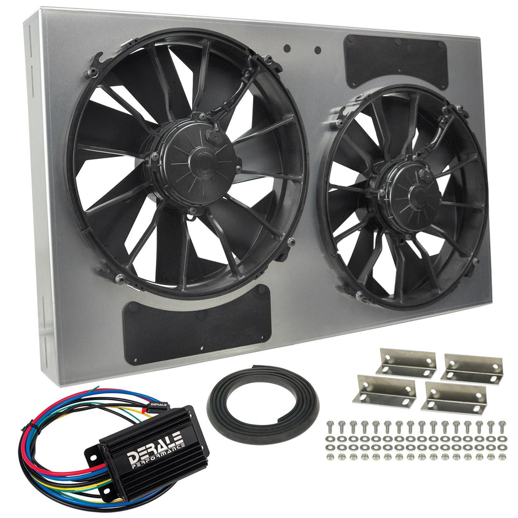 Get complete control of your engine temperature! Derale PWM electric fan Powerpacks have integrated their high-performing PWM fan controllers into the fan units. The PWM fan controller features built-in soft start technology and utilizes pulse width modulation to constantly adjust electric fan speeds from 0-100%. This maintains the optimal engine operating temperature while allowing the fans to operate at the percentage needed, instead of 100% all the time. By using the fans at the percentage needed component life is increased and amperage spikes are eliminated. The Powerpacks use high output electric fans incorporated into precision engineered shrouds. The Derale Performance Powerpacks are available with single or dual fans and can conquer the most difficult cooling conditions.Brand: Derale Cooling Products