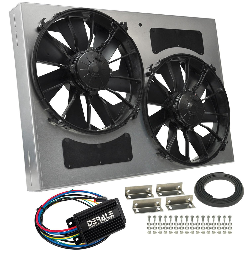 Get complete control of your engine temperature! Derale PWM electric fan Powerpacks have integrated their high-performing PWM fan controllers into the fan units. The PWM fan controller features built-in soft start technology and utilizes pulse width modulation to constantly adjust electric fan speeds from 0-100%. This maintains the optimal engine operating temperature while allowing the fans to operate at the percentage needed, instead of 100% all the time. By using the fans at the percentage needed component life is increased and amperage spikes are eliminated. The Powerpacks use high output electric fans incorporated into precision engineered shrouds. The Derale Performance Powerpacks are available with single or dual fans and can conquer the most difficult cooling conditions.Brand: Derale Cooling Products