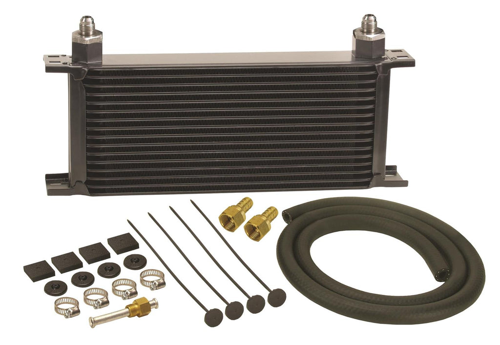 Derale stacked plate fluid coolers have more surface area than tube and fin coolers, giving you more efficient heat extraction. The units feature embossed turbulator plates and durable, brazed aluminum construction. They are equipped with AN male ports and are also available with an OEM-spec, high-temperature oil hose with swedged hose ends. Derale Performance coolers have pre-drilled mounting brackets and include hardware where noted.Brand: Derale Cooling Products