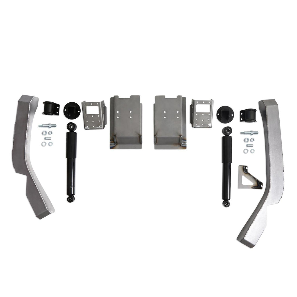 Notes: Kit includes the leaf springs, shackles, U-bolts, shock mounts. and mounting hardware. This kit is for vehicles that have the mini-tub fenders installed, Use with narrow fuel tank.