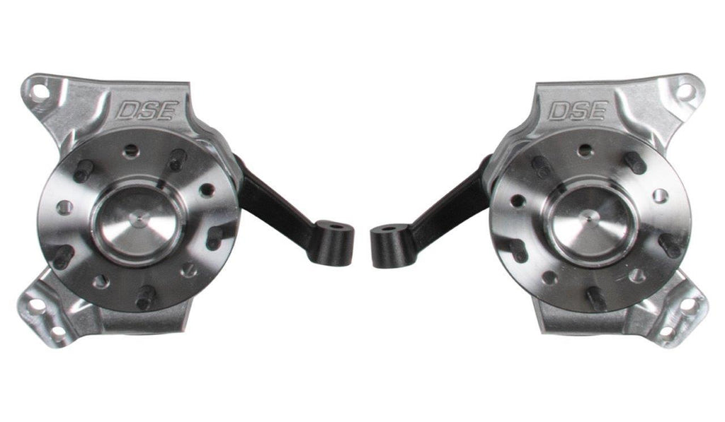 In the kits you'll find DSE forged aluminum spindles with forged steel steering arms and uprights featuring truck hub pack wheel bearings with a dual bolt pattern (no more packing messy wheel bearings). The hub bearings use modern OE-style GMT800 brake design, allowing stock or aftermarket brake options.