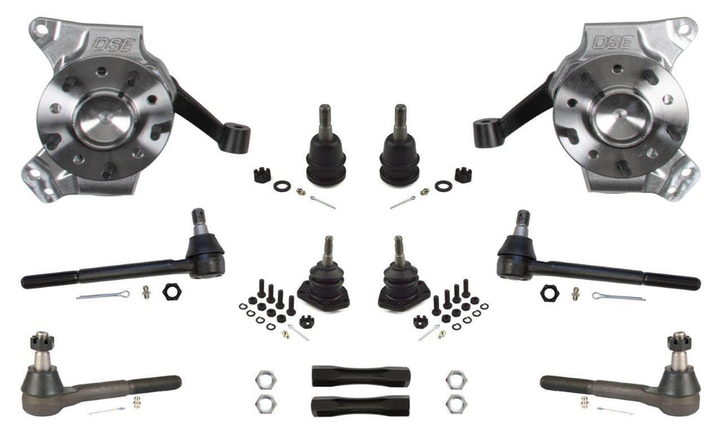 In the kits you'll find DSE forged aluminum spindles with forged steel steering arms and uprights featuring truck hub pack wheel bearings with a dual bolt pattern (no more packing messy wheel bearings). The hub bearings use modern OE-style GMT800 brake design, allowing stock or aftermarket brake options.