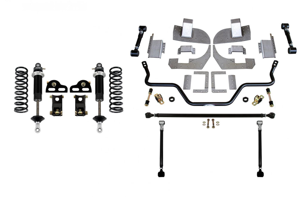 Detroit Speed QUADRALink rear suspension kits offer 4-link geometry for the best possible handling. These kits are a great way to upgrade from your original leaf spring suspension. They feature Detroit Speed's patented Swivel-Link that allows the suspension to fully articulate with smooth, solid motion and no binding—and it's done without Heim joints! QUADRALink uses tuned high-Durometer rubber bushings, rather than noisy, short-life Heim joints or squeaky urethane bushings. Plus, unlike other kits, these suspensions utilize an adjustable panhard rod that provides precise and effective rear axle lateral location during hard cornering. The long upper links provide great pinion and U-joint angle control, while the rear upper shock crossmember strengthens the rear body and frame section. QUADRALink rear suspension kits are available for a variety of specific vehicle applications; select the model to enhance your ride!