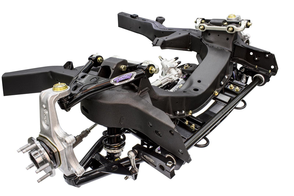 The system features "Detroit Tuned" quick ratio power rack and pinion steering along with forged Detroit Speed aluminum uprights. The bolt-on powdercoated cradle assembly improves suspension geometry, provides rigid mounting for the rack and pinion, and includes integrated tie down eyelets. DSE/JRi "Detroit Tuned" coilover shocks/springs allow for spring rate tuning and ride height adjustment. Also included are a splined sway bar with aluminum arms, composite bushings, powdercoated tubular upper and lower control arms with Delrinâ„¢ bushings, and forged offset upper control arm mounting brackets with caster tuner bushings to optimize suspension geometry and provide clearance for Gen V LT4 engines. Torrington bearings and a spanner tool for easy spring height adjustments complete the kits.