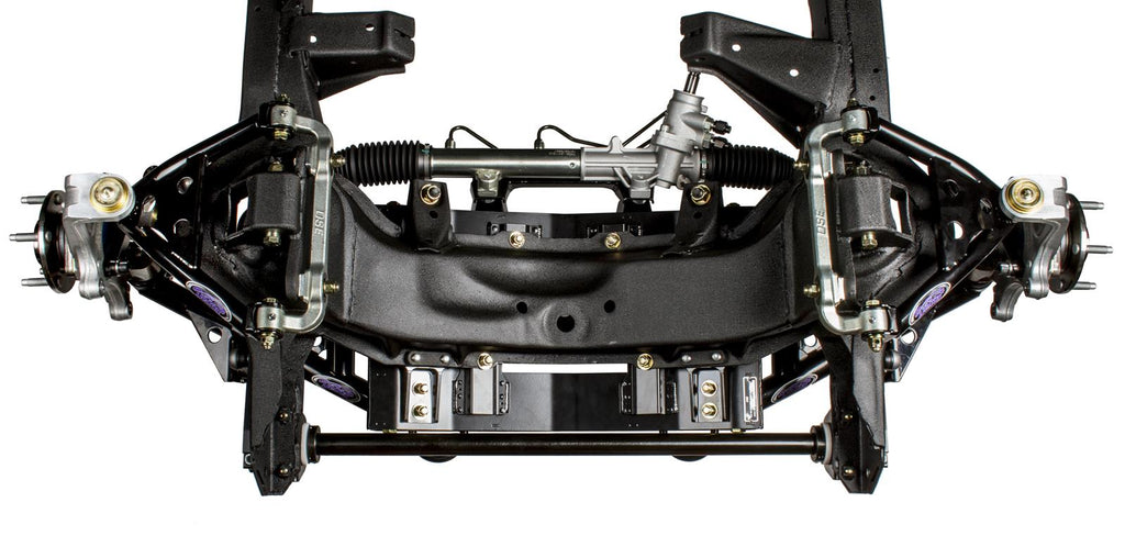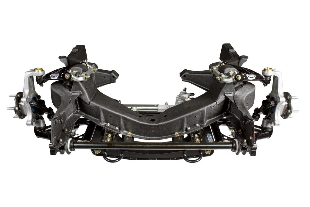 The system features "Detroit Tuned" quick ratio power rack and pinion steering along with forged Detroit Speed aluminum uprights. The bolt-on powdercoated cradle assembly improves suspension geometry, provides rigid mounting for the rack and pinion, and includes integrated tie down eyelets. DSE/JRi "Detroit Tuned" coilover shocks/springs allow for spring rate tuning and ride height adjustment. Also included are a splined sway bar with aluminum arms, composite bushings, powdercoated tubular upper and lower control arms with Delrinâ„¢ bushings, and forged offset upper control arm mounting brackets with caster tuner bushings to optimize suspension geometry and provide clearance for Gen V LT4 engines. Torrington bearings and a spanner tool for easy spring height adjustments complete the kits.