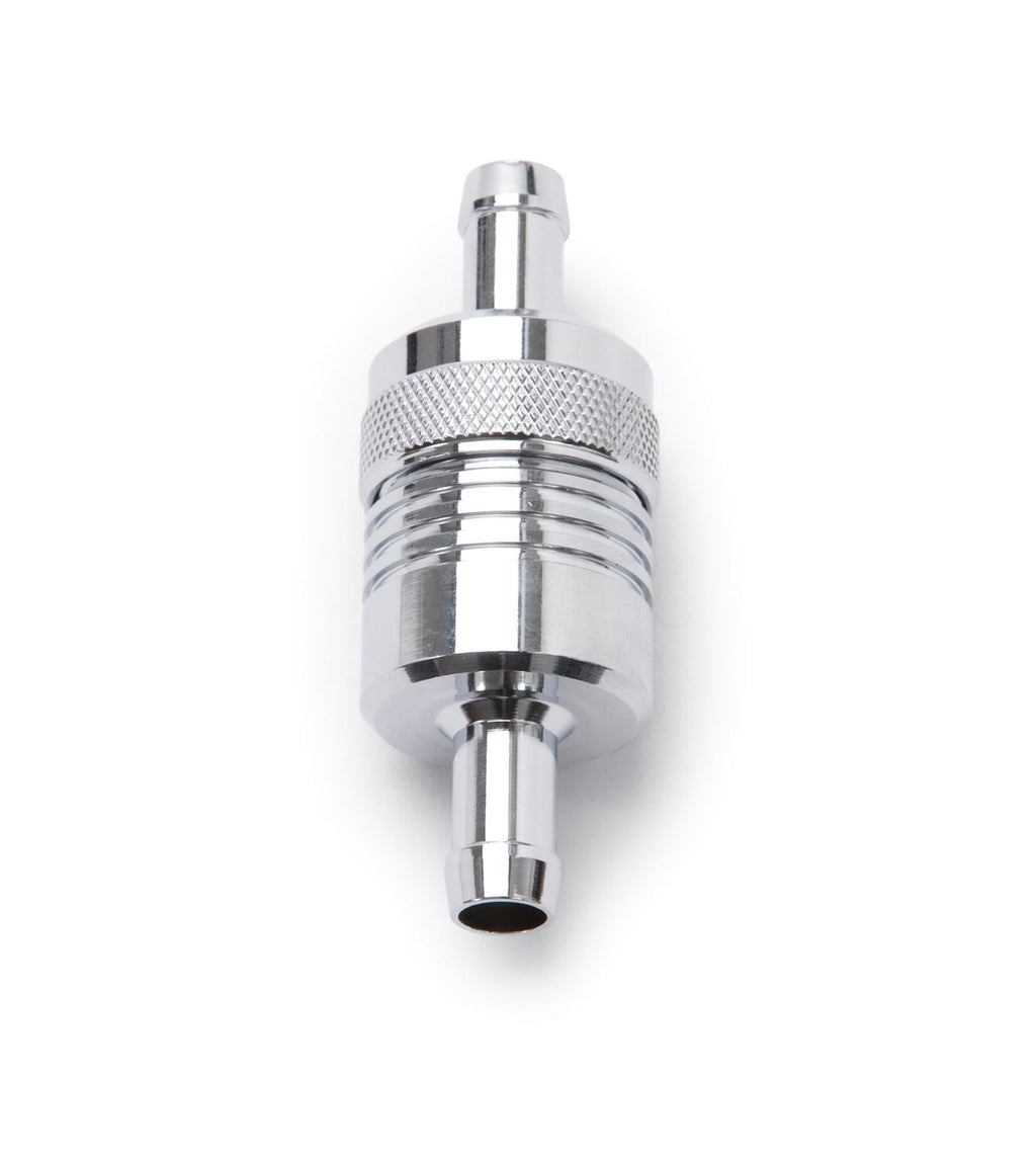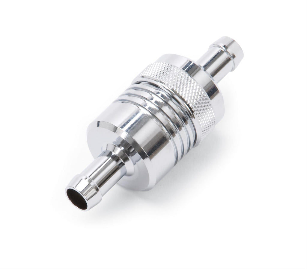 Edelbrock aluminum street fuel filters are high-quality fuel filters designed for carbureted engines. They feature a sintered-bronze 40 micron element that can be cleaned or replaced. They are available in chrome, as well as blue, red, and black anodized finishes to give you the personalized touch you're looking for. Get a fuel filter with a name you can trust, on and off the track, with these Edelbrock aluminum street fuel filters.Brand: Edelbrock