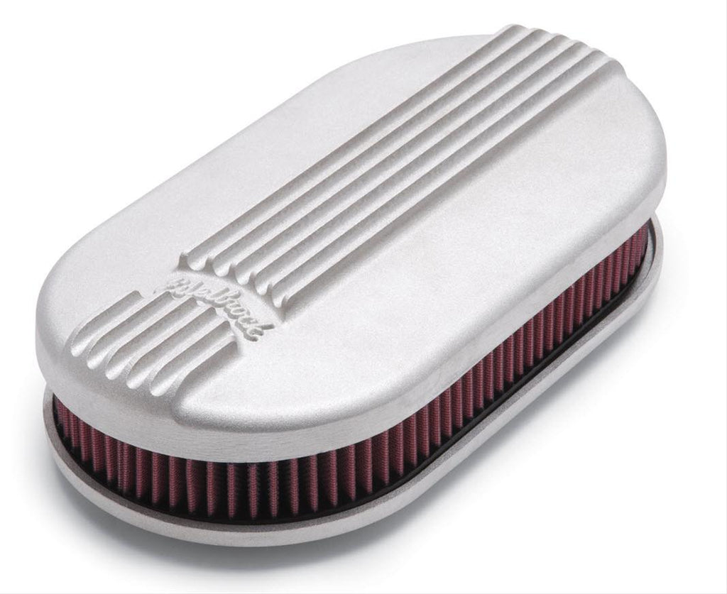 Edelbrock Classic Series air cleaners were created to perfectly match Edelbrock's popular classic aluminum finned valve covers. Three models for single or dual-quads give you plenty of options for that "just right" look on any nostalgic rod or musclecar. Additionally, the small oval air cleaners provide adequate hood clearance in demanding applications, as well as a coordinated appearance with the classic finned look. Classic Series air cleaners are available in a polished aluminum or durable black powdercoated finish. They come with a medical-grade, pre-oiled cotton gauze element for excellent filtration.Brand: Edelbrock