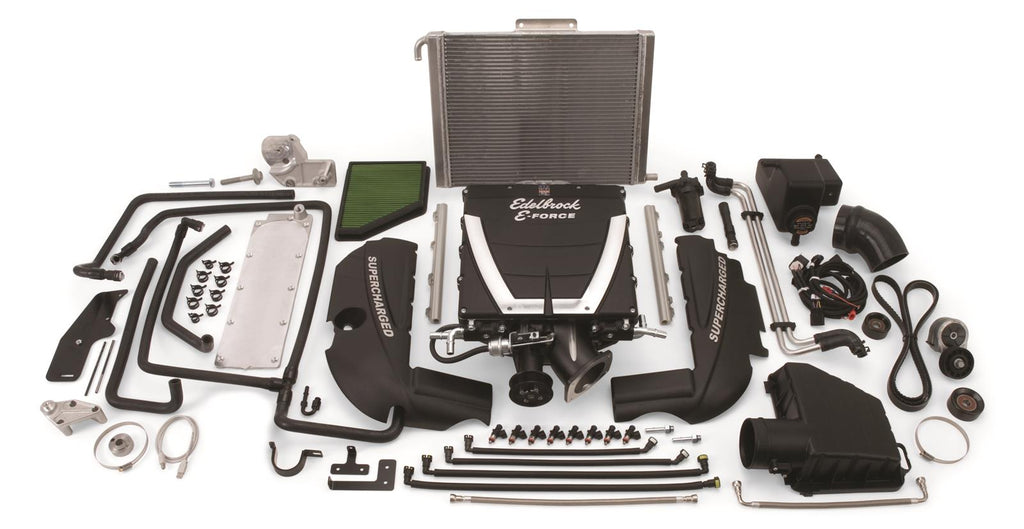 Edelbrock E-Force Camaro SS Stage 1 street legal supercharger kits transform your Camaro into a force to be reckoned with! The kits utilize Eaton's Gen VI TVS supercharger rotors, featuring a four lobe design with a full 160 deg. of twist for maximum flow, minimum temperature rise, quiet operation, and the reliability for which Eaton is known. The Edelbrock E-Force Camaro SS street legal supercharger kits are a complete system that maximizes efficiency and performance by minimizing air restriction into, and out of, the supercharger. The supercharger housing itself is integrated into the intake manifold for a seamless design with minimal components, eliminating the possibility of vacuum leaks between gasket surfaces. The system also utilizes a front drive, front inlet configuration giving it the shortest, least restrictive inlet path on the market. The upper plenum area is enclosed by a top cover that has been designed to provide an appealing and distinctive under-hood appearance. This configuration allows for a compact package that can fit under the stock hood and cowl of the Camaro, without sacrificing runner length, or intercooler area. Edelbrock E-Force Camaro SS street legal supercharger kits provide neck snapping performance that is safe to operate on a completely stock engine. The kits are 50-state emission legal, and come with a 3-year 36,000 mile warranty (restrictions apply) so that there are no worries when installing it on a brand new car. Claim the streets with the added influence of these E-Force supercharger kits from Edelbrock.Brand: Edelbrock