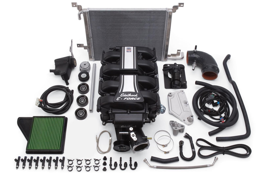 Edelbrock E-Force Mustang Stage 1 Street Legal supercharger kits transform your Mustang into a force to be reckoned with! The kits utilize Eaton's Gen VI TVS supercharger rotors, featuring a four lobe design with a full 160 degrees of twist for maximum flow, minimum temperature rise, quiet operation, and the reliability for which Eaton is known. These Mustang supercharger systems are exclusively designed to provide instant, reliable and safe horsepower for a stock Mustang with low boost for minimum stress on the engine. They feature minimum air restriction in and out of the supercharger, along with individual long intake runners for maximum low end torque for great off throttle performance. Claim the streets with the added influence of these E-Force supercharger kits from Edelbrock.Brand: Edelbrock