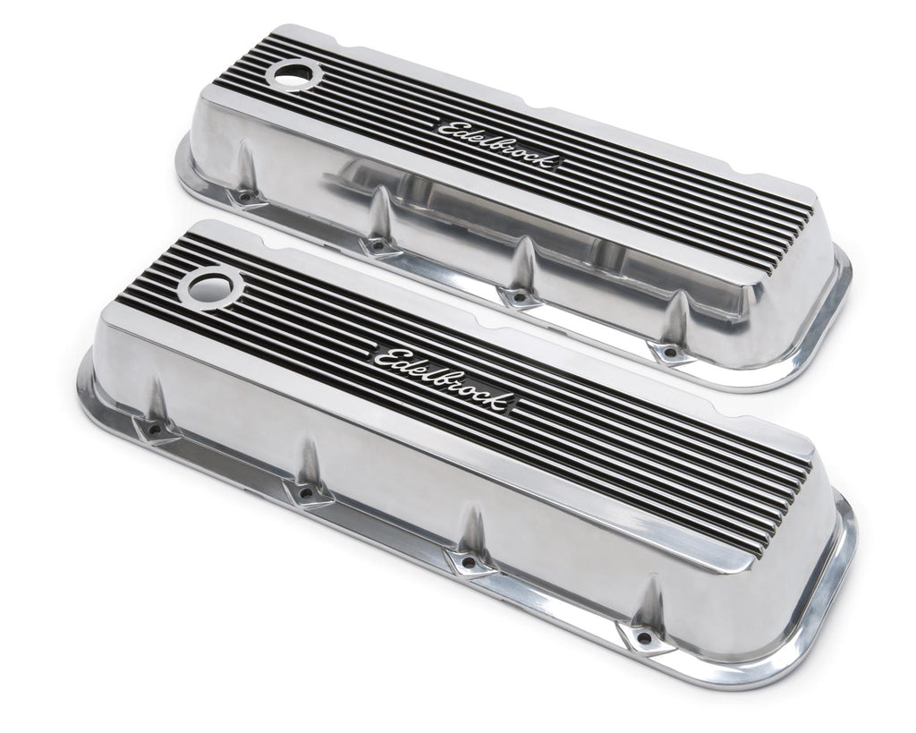 Edelbrock Elite II Series valve covers are the next generation of the original Elite Series valve covers. The Elite II Series feature a design that is influenced by the Elite Series originally released in 1985, but with a new modern take on this classic look. The valve covers are made from heavy-gauge, die-cast aluminum and are finished off with a show quality high luster polished finish. The raised fins are accented by a contrast gloss black finish between the fins for the definitive Elite Series look. Depending on application, Elite II valve covers are available in both stock and tall styles. Tall profile valve covers are 2 in. taller than stock and clear most roller rockers and valve train components, while the stock profile versions clear accessories like air-conditioning and alternator brackets.Brand: Edelbrock