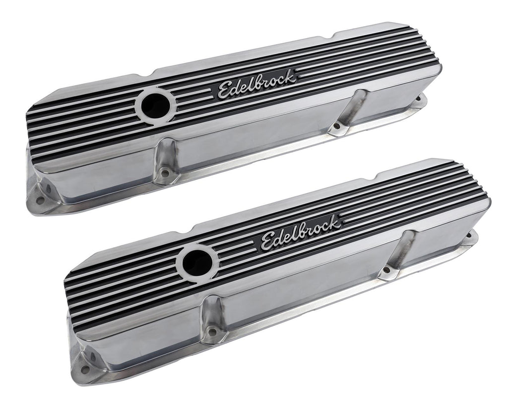 Edelbrock Elite II Series valve covers are the next generation of the original Elite Series valve covers. The Elite II Series feature a design that is influenced by the Elite Series originally released in 1985, but with a new modern take on this classic look. The valve covers are made from heavy-gauge, die-cast aluminum and are finished off with a show quality high luster polished finish. The raised fins are accented by a contrast gloss black finish between the fins for the definitive Elite Series look. Depending on application, Elite II valve covers are available in both stock and tall styles. Tall profile valve covers are 2 in. taller than stock and clear most roller rockers and valve train components, while the stock profile versions clear accessories like air-conditioning and alternator brackets.Brand: Edelbrock