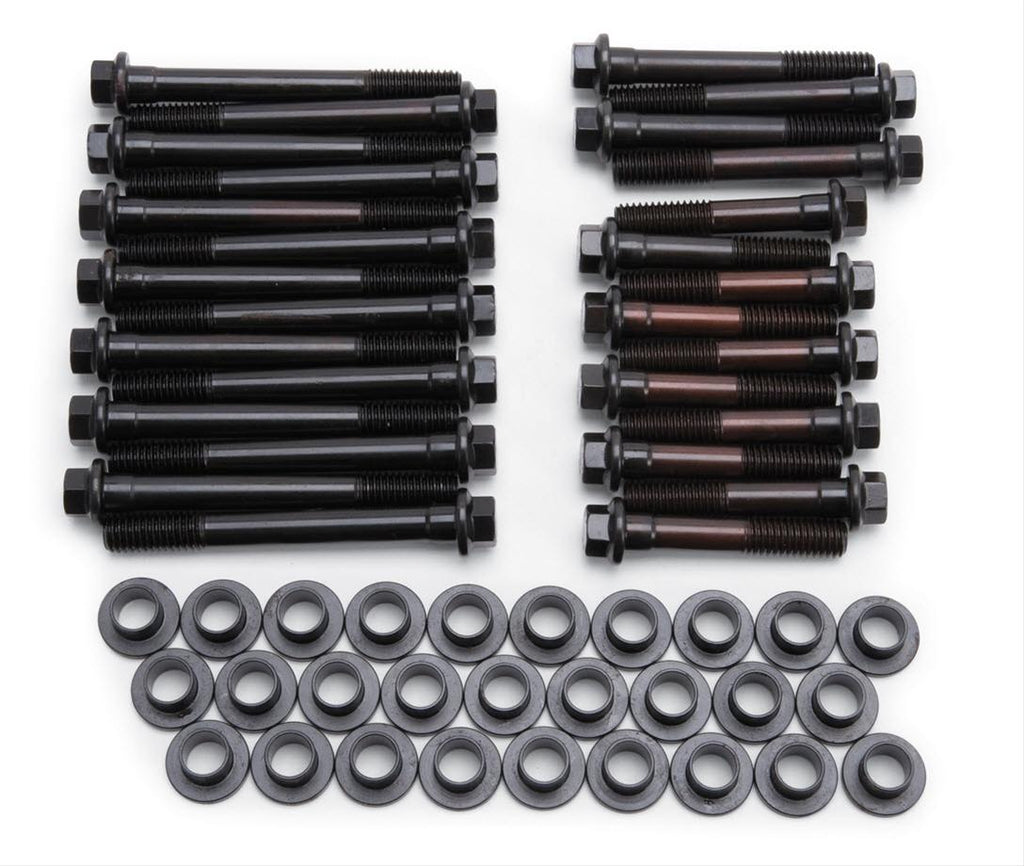 Manufactured by ARP, Edelbrock head bolt kits contain a complete set of the highest quality head bolts and hardened washers available. They are cold-formed to ensure molecular integrity and heat-treated prior to thread rolling and machining. Reduced-diameter bolt heads eliminate the need for valvetrain removal to facilitate cylinder head re-torquing. Hardened and parallel-ground washers are included, and they're rated at 170,000 psi.Brand: Edelbrock