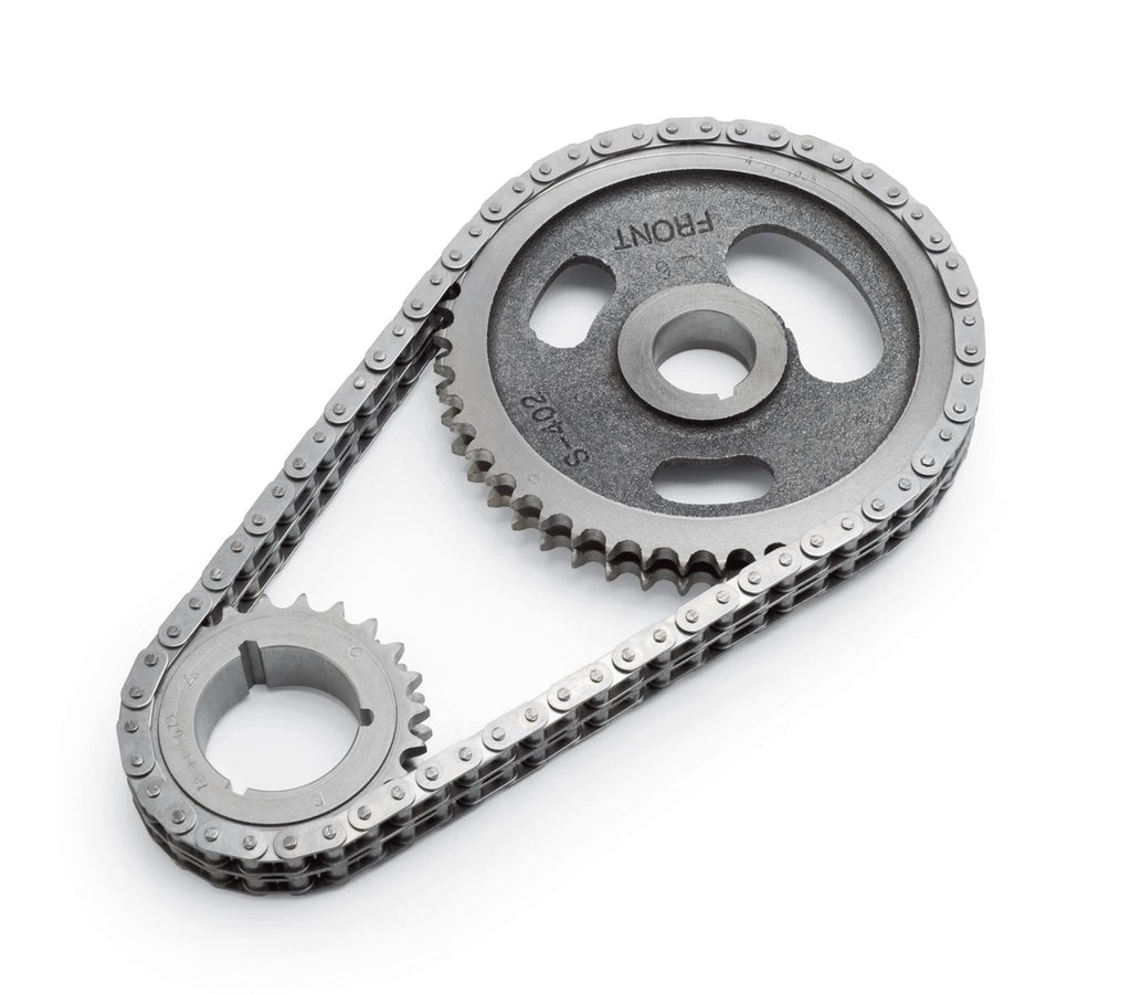 Edelbrock Performer-Link true roller timing chain sets are designed for use with either performance or stock cams. They have a solid-bushing chain for a true bearing surface that rolls with the sprockets, eliminating chain stretch. Crank gears are machined from SAE 1144 stress-proof steel. Most Edelbrock Performer-Link true roller timing chain sets have three keyways to ensure accurate timing for early or late model vehicles, and to allow you to set cam timing 4 degrees advanced, 4 degrees retarded, or stock. However, 50-state (stock replacement) sets have single keyways. Edelbrock Performer-Link true roller timing chain sets are not for use above 6,500 rpm.Brand: Edelbrock
