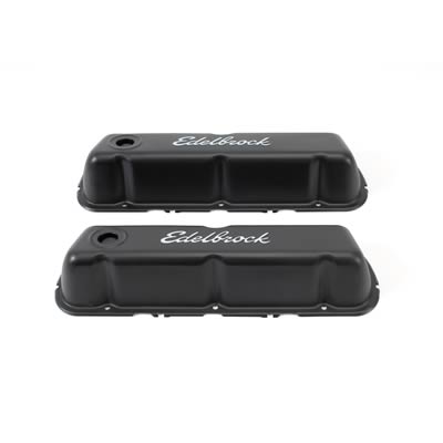 Edelbrock's Signature series black valve covers are engineered for function and styled for good looks. They feature a powdercoated finish for long lasting good looks, and have stock-style breather baffles that prevent oil passage to the PCV valve. They accept all emissions equipment, including PCV valves, and include rubber grommets for the breather and PCV valve holes. The Edelbrock Signature Series black valve covers clear most aluminum rocker arms and moderate lift cams. Some applications come in a high-profile design that's 1 1/4 in. taller than stock, and clears most roller rockers and valvetrain components, and a low-profile design that clears air conditioning and alternator brackets.Brand: Edelbrock