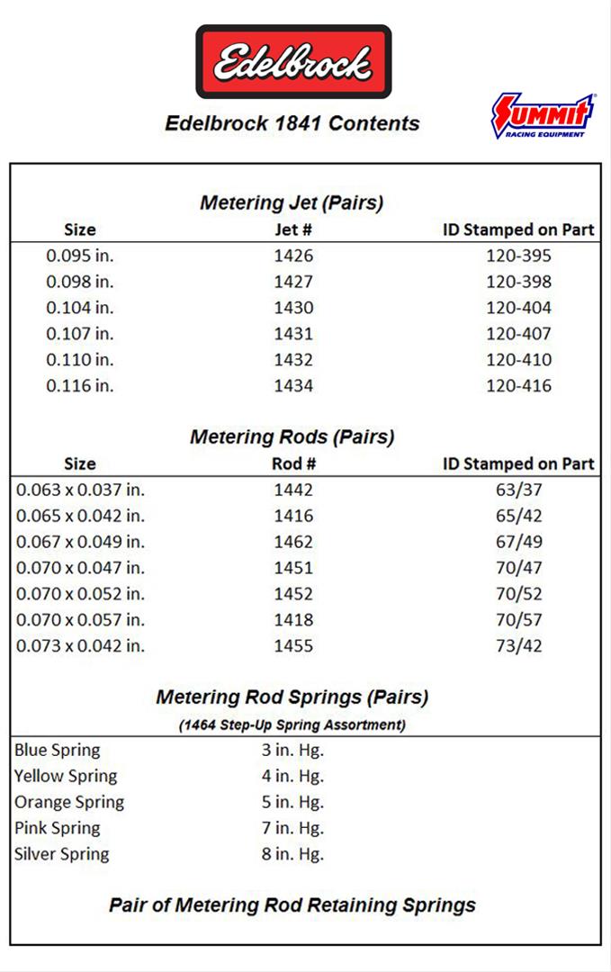 Edelbrock Thunder Series AVS carburetor calibration kits are designed to tune your car to match any engine or track condition. These kits (except for special applications) include an assortment of metering rods and jets, a pair of metering rod retaining springs, and a complete assortment of step-up springs.Brand: Edelbrock