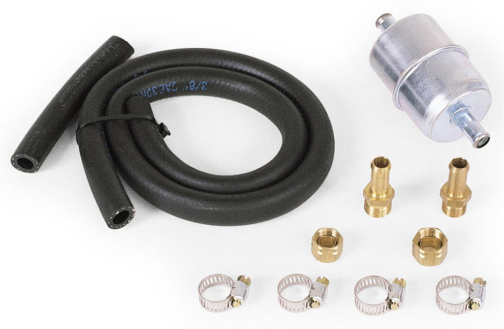 Edelbrock universal fuel hose and filter kits allow you to add a fuel filter where none existed. Utilizing part of your stock steel fuel line, they offer a quick fix--simply cut the stock line, install the compression fitting, add the neoprene hose, clamp, and fuel filter, and connect to your carburetor. Kits include fuel filter, fuel hose, special fittings to adapt 5/16 in. and 3/8 in. steel line to hose, and stainless steel worm-type hose clamps. Keep your fuel clean with Edelbrock universal fuel hose and filter kits.Brand: Edelbrock