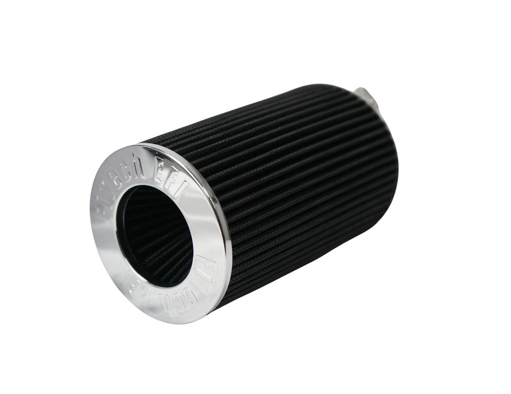 FiTech's cone style air filters feature an open design of the conical filter that allows the engine to pull air from both inside the cone, as well as from the outside perimeter. That nearly doubles the element area to capture any contaminant particles so only the cleanest air makes it into your intake. The cone shaped filter is capped on both ends with a show quality chrome housing securing the filter and a rubber coupler and heavy-duty clamp are supplied to seal over the flange of the throttle body creating a tight seal and secure mount. The cotton-based filter material is pre-oiled and ready to mount and can be washed and reused for many miles and years to come.Brand: FiTech Fuel Injection
