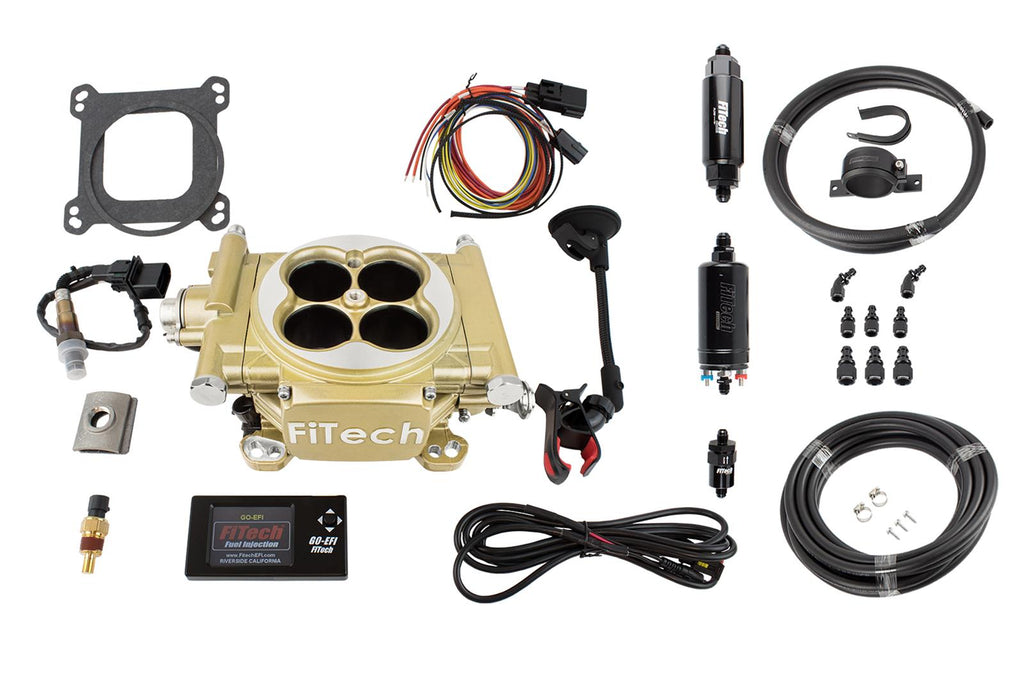 FiTech Easy Street 600 hp EFI system fuel injection master kits deliver an electronic fuel injection kit with a fuel delivery solution. Each master kit pairs the classic gold appeal and modern performance of FiTech's Easy Street 600 hp throttle body with one of several inline or in-tank fuel delivery solutions, providing everything you need to convert your carbureted vehicle to EFI—all with one part number.
