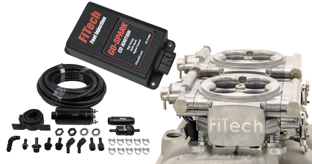 FiTech Go EFI 2x4 625 hp system/Go-Spark fuel injection master kits are inclusive EFI kits with fuel delivery solutions, plus an upgrade to high-powered sparks for improved combustion and power output. In these master kits, FiTech mates their 2x4 TBIs with either a Go Fuel in-tank or fuel cell pump module, or Go EFI in-line pump kit to provide everything needed to convert your carbureted vehicle to EFI. And going a step further, the Go-Spark CDI ignition will elevate the spark for even more improved performance. Choose the master kit with your preferred fuel delivery solution.