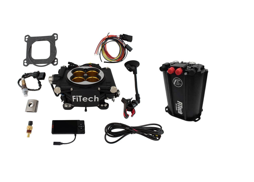 FiTech offers Go EFI 8 1200 hp fuel injection systems with dual pump Force Fuel delivery master kit. Some models also include Go Spark CDI box. These units have a matte black finish. Go EFI systems are perfect for your everyday driver, right up to your weekend street machine or bracket racer. They feature the fastest, most accurate self-learning available, timing control, wet flow annular discharge, and tons of additional features. Go EFI systems fit any 4-bbl intake manifold (including 4500 flange) and are the most self-contained and full-featured unit of this type. The ECU (computer) is mounted on the throttle body, which greatly simplifies installation. No hole in your firewall and no unsightly harness draped across your engine! They are also the only computer-mounted throttle bodies that offer spark control without the need for an external spark box or special distributor. Other features include a built-in fuel pressure regulator and hand-held controller with touch screen for quick and easy initial set-up.