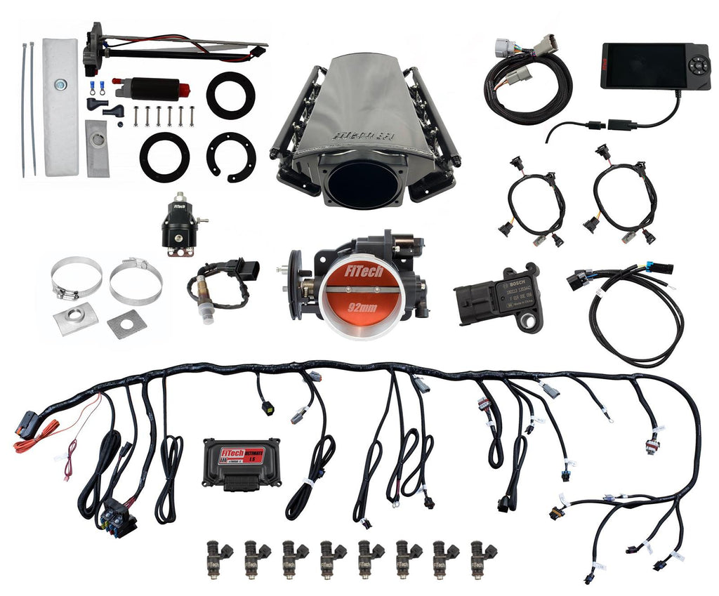 FiTech Ultimate LS EFI 500 hp fuel injection systems with Go Fuel in-tank module combines incredible engineering and construction for top-of-the-line performance. FiTech fabricated many billet aluminum parts for their Ultimate LS EFI 500 hp systems, including a 92mm throttle body, high-volume fuel rails, and a 1,500 to 6,500 rpm powerband intake manifold. They combine sequential spark and fuel control with 36 lbs./hr. injectors, a plug-and-play wiring harness, and a color touch screen self-learning ECU. This allows for programing two fan control outputs, most tach and speedometer output drivers, and target AFR and timing on the fly.