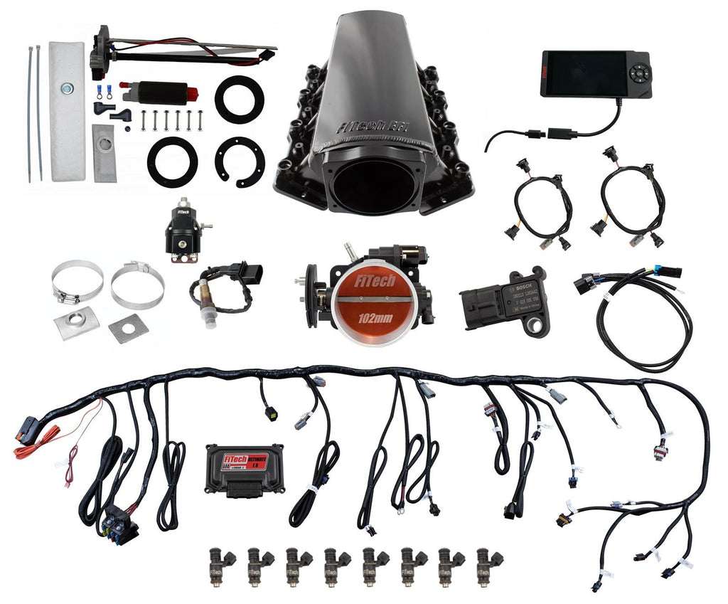 FiTech Ultimate LS EFI 750 hp fuel injection systems with Go Fuel in-tank module combines incredible engineering and construction for top-of-the-line performance. FiTech fabricated many billet aluminum parts for their Ultimate LS EFI 750 hp systems, including a 102mm throttle body, high-volume fuel rails, and a 1,500 to 6,500 rpm powerband intake manifold. They combine sequential spark and fuel control with 55 lbs./hr. injectors, a plug-and-play wiring harness, and a color touch screen self-learning ECU. This allows for programing two fan control outputs, most tach and speedometer output drivers, and target AFR and timing on the fly.