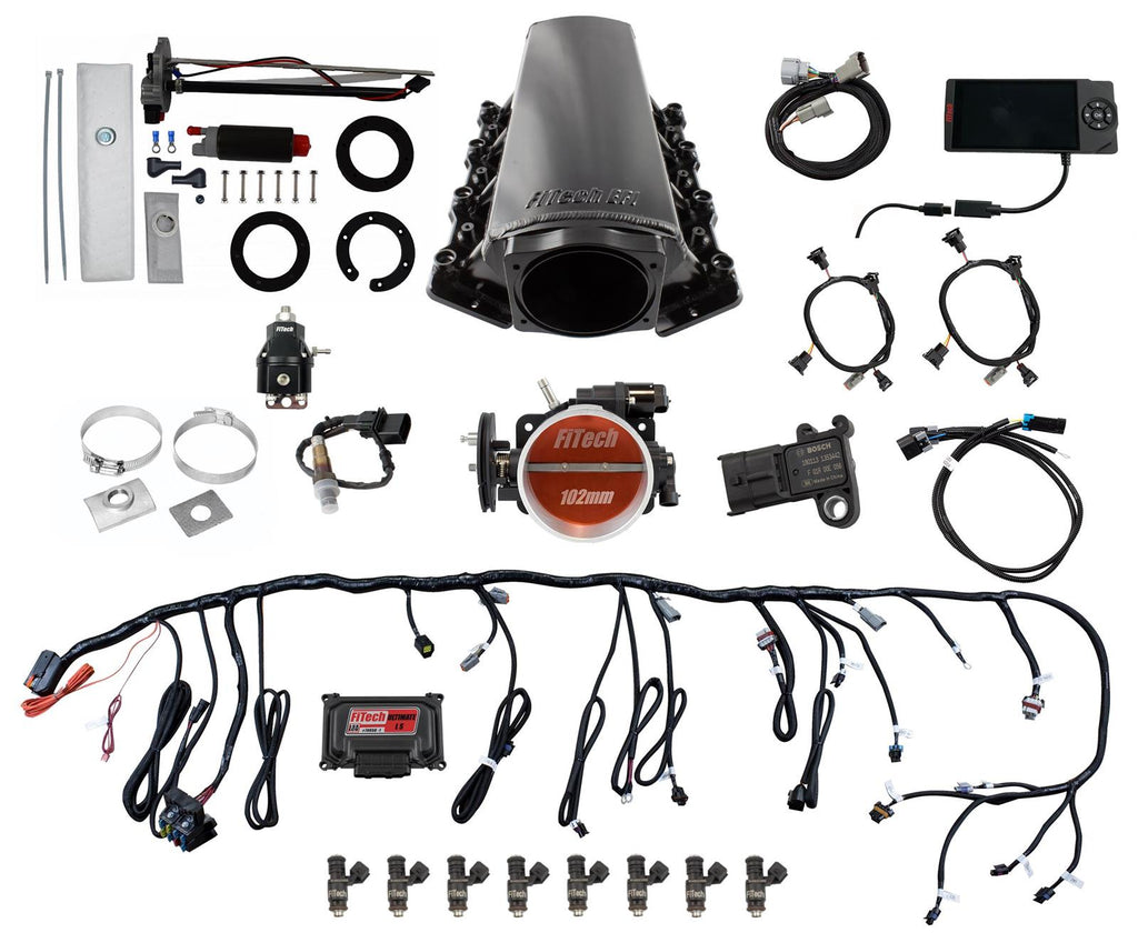 FiTech Ultimate LS EFI 750 hp fuel injection systems with Go Fuel in-tank module combines incredible engineering and construction for top-of-the-line performance. FiTech fabricated many billet aluminum parts for their Ultimate LS EFI 750 hp systems, including a 102mm throttle body, high-volume fuel rails, and a 1,500 to 6,500 rpm powerband intake manifold. They combine sequential spark and fuel control with 55 lbs./hr. injectors, a plug-and-play wiring harness, and a color touch screen self-learning ECU. This allows for programing two fan control outputs, most tach and speedometer output drivers, and target AFR and timing on the fly.
