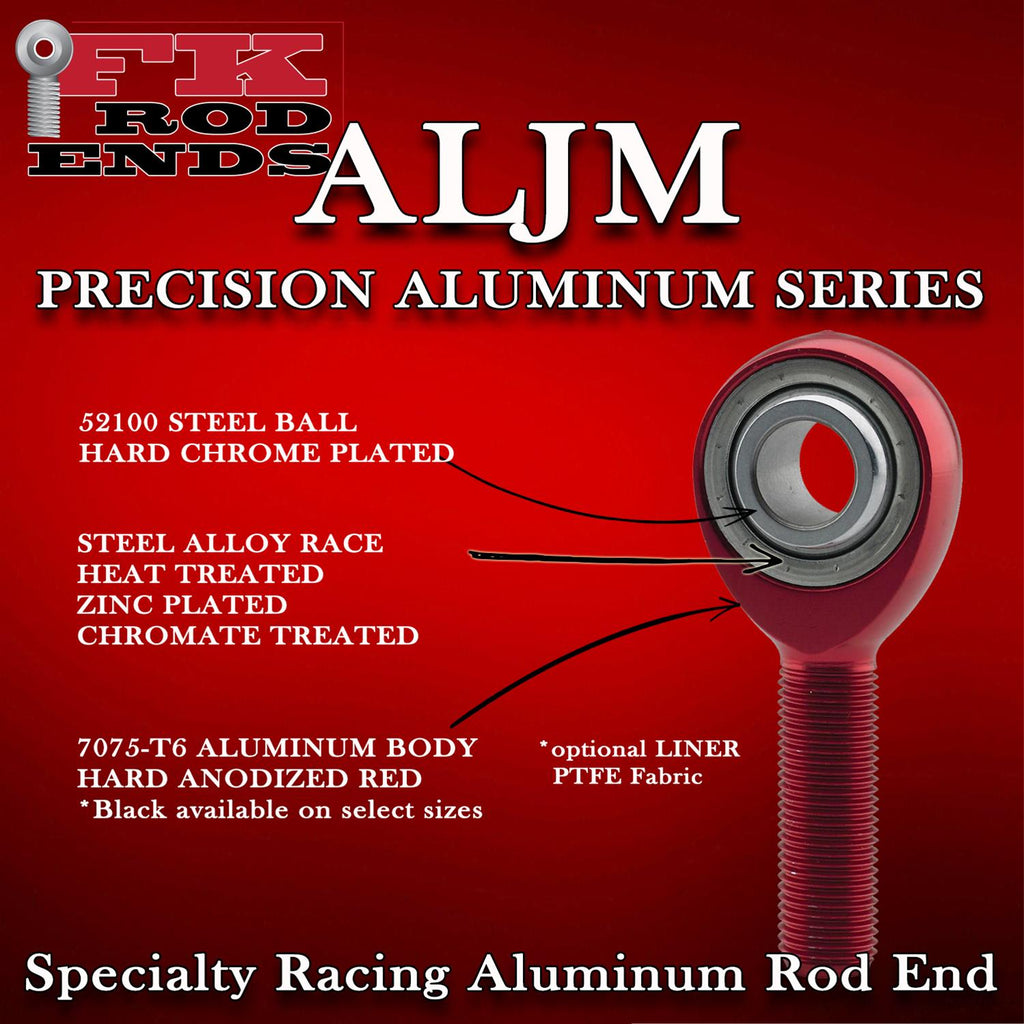 Thanks to demand from the open wheel market, FK Rod Ends offers ALJM Series rod ends for use on bird cages with a 3/8 in. bore. Available in a choice of sizes, ALJM Series rod ends also fit Jacobs ladders without drilling or using bushings. These 3-piece, precision wear-resistant rod ends feature 7075-T6 aluminum bodies with a hard, red anodized finish. Heat-treated steel alloy races are zinc plated and chromate-treated for strength and durability. ALJM Series rod ends have a heat-treated, hard chrome plated 52100 steel ball. PTFE liners are available for these rod ends.Brand: FK Rod Ends