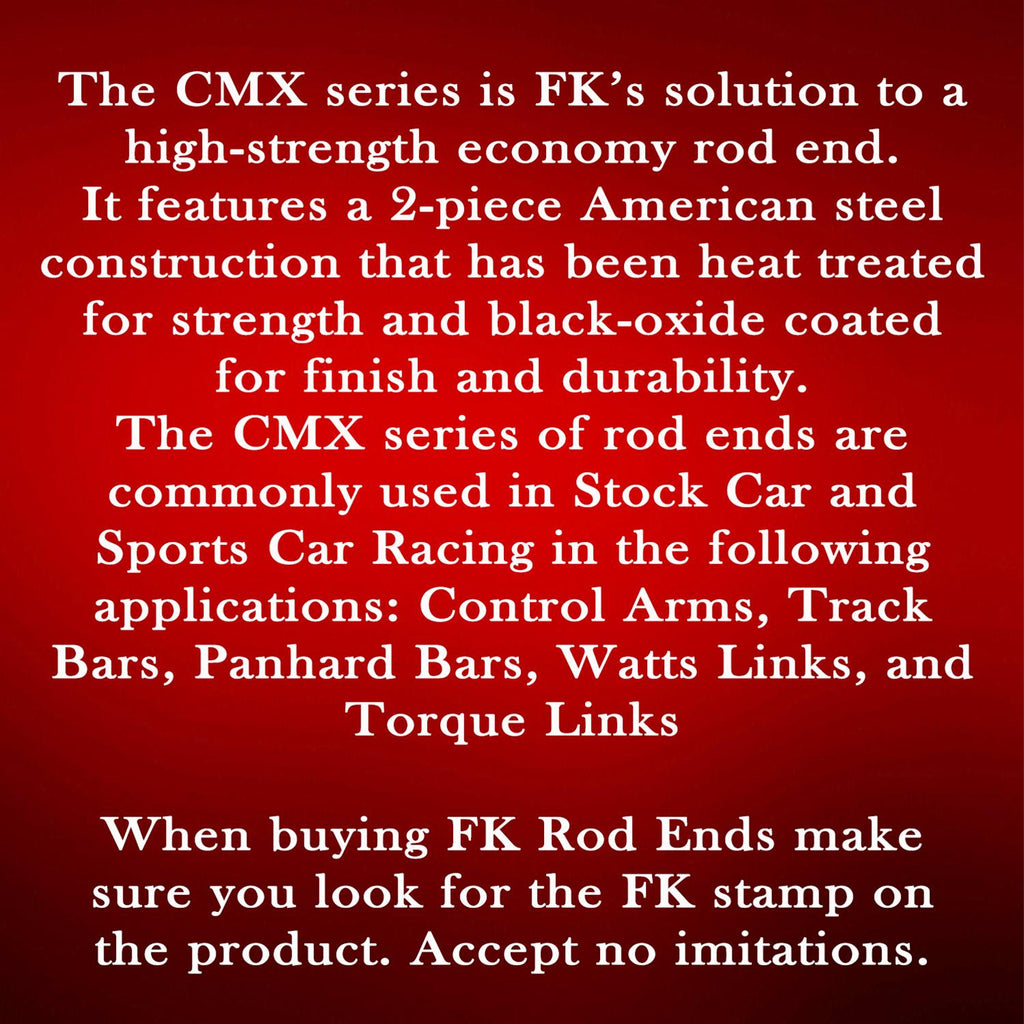 FK CMX Series rod ends are economy high-strength rod ends featuring 2-piece, metal-to-metal construction. CMX Series rod ends have an alloy steel body that's heat-treated for strength and a black-oxide finish for durability and corrosion resistance. The ball is made of 52100 steel and is hard chrome plated for long life.Brand: FK Rod Ends