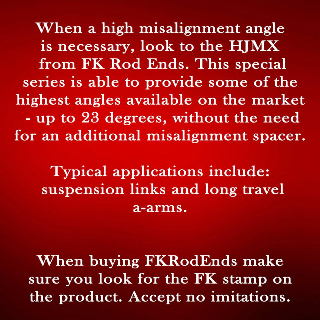Rod ends are probably one of the most common parts on your race car. FK 3-piece precision HRSMX-T/HIN-T Series rod ends offer you durability, strength, and peace of mind. They are high strength with high misalignment built in for increased articulation without spacers. And they have PTFE liners for self-lubrication! Ever try to grease an already installed rod end? Plus, there's no greased fitting to attract dirt or weaken your rod end. HRSMX-T/HIN-T Series rod ends are built from zinc plated, heat-treated, chromate treated 4340 steel with hard chrome plated steel balls and a chromate treated, zinc plated steel alloy race. You won't think about that bargain rod end--until it breaks. Can you afford that? Choose FK HRSMX-T/HIN-T Series rod ends.Brand: FK Rod Ends