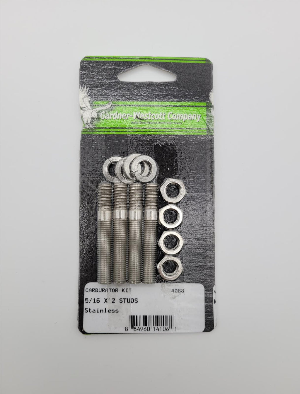 Gardner-Westcott carburetor stud kits come complete with four studs, washers, and nuts. The studs are 2 in. overall in length. These steel stud type fasteners are chrome plated.Brand: Gardner-Westcott Company