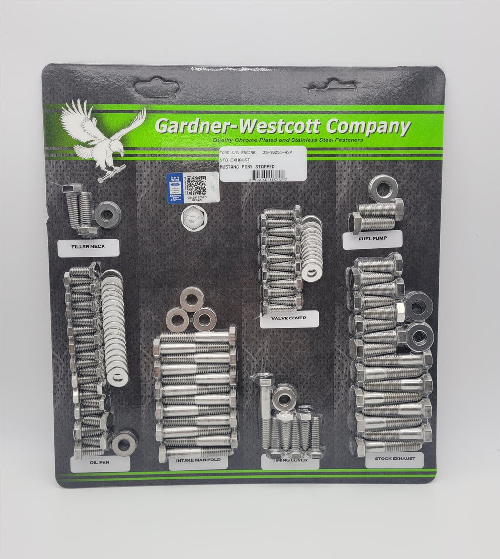 Gardner-Westcott engine dress-up bolt kits add a touch of class under your hood. The hardware is offered in a variety of materials, finishes, and head styles—with your choice of automotive logos or designs etched on the fasteners. Over a hundred different kits are available; order the model recommended for your vehicle and engine application.Brand: Gardner-Westcott Company