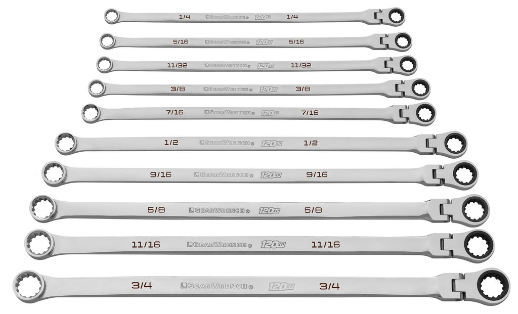 GearWrench 120XP flex head ratcheting combination wrench sets are offered in several different SAE and metric groupings. Each wrench features double-stacked 60-tooth pawls (120 ratcheting positions) providing a 3-degree swing arc to turn fasteners in tighter confines, along with a universal spline drive, and an XL beam design that is up to 25 percent longer than standard wrenches for improved reach, leverage, and torque. Choose the sets you'd prefer for your toolbox.