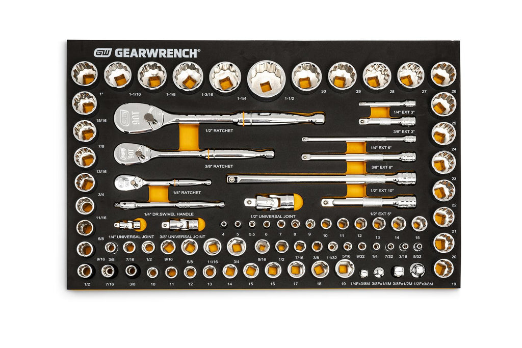 GearWrench 90T SAE/metric mechanics modular tool sets provide a mix of 1/4, 3/8, and 1/2 in. drive 90T ratchets, 6- and 12-point sockets, extensions, and adapters totaling 83-pieces packed in a protective, modular tray to augment your tool arsenal. Designed with professional users in mind for better productivity, access, and strength, the ratchets' 90-tooth gear delivers a 4-degree swing arc making turning a fastener in tight confines easier.