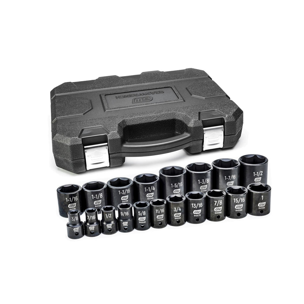 GearWrench impact socket sets are offered in many different groupings to augment your tool arsenal. Choose from several drive sizes, SAE or metric, standard or deep, or sets with a combination of all these characteristics and more. Each socket is manufactured from chromoly alloy steel (Cr-Mo) for exceptional strength and durability and finished with a manganese phosphate coating or black oxide for corrosion resistance. Choose the socket sets you desire to fill your toolbox.