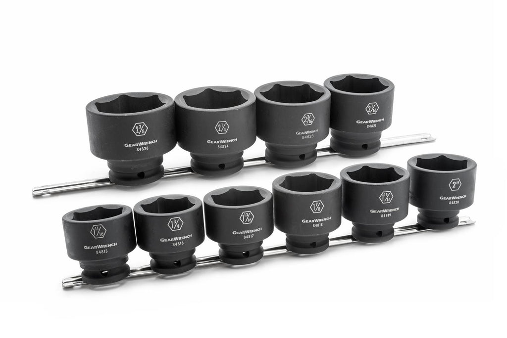 GearWrench impact socket sets are offered in many different groupings to augment your tool arsenal. Choose from several drive sizes, SAE or metric, standard or deep, or sets with a combination of all these characteristics and more. Each socket is manufactured from chromoly alloy steel (Cr-Mo) for exceptional strength and durability and finished with a manganese phosphate coating or black oxide for corrosion resistance. Choose the socket sets you desire to fill your toolbox.
