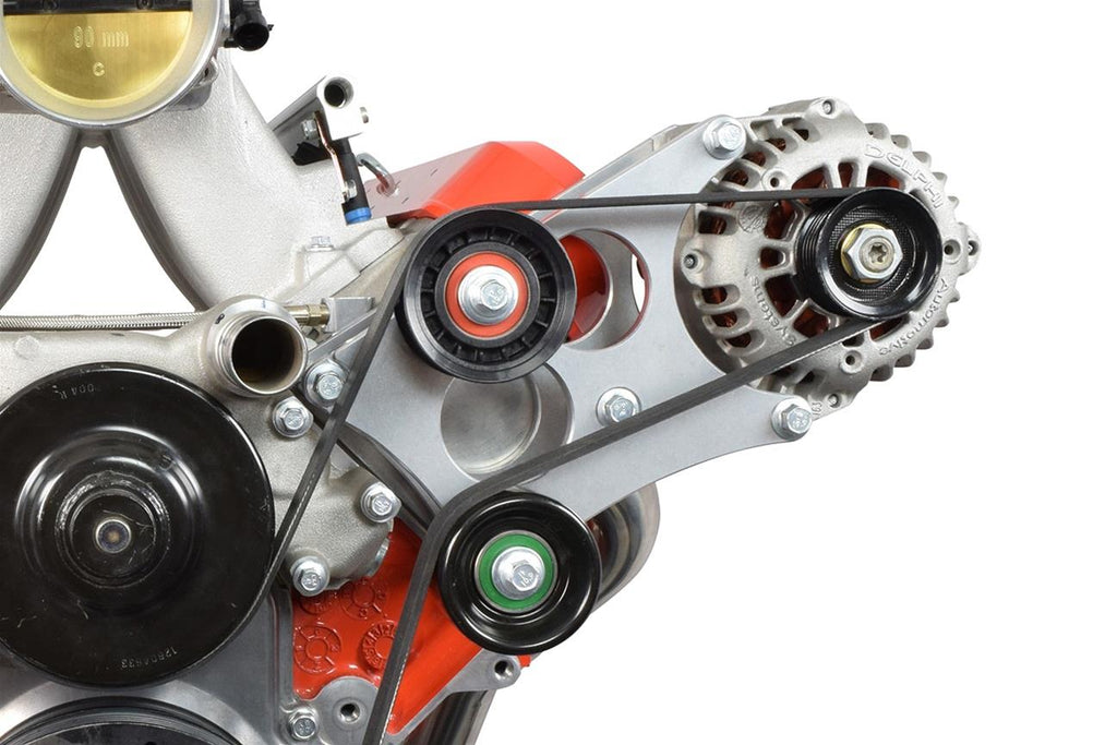 Notes: Kit comes with a bracket and idler pulleys. Kit requires a crank pulley from a Corvette, CTS-V, G8, or SS. LS Corvette heavy duty billet alternator bracket kit. LSX, LS1, 5.7L top driver head mount.