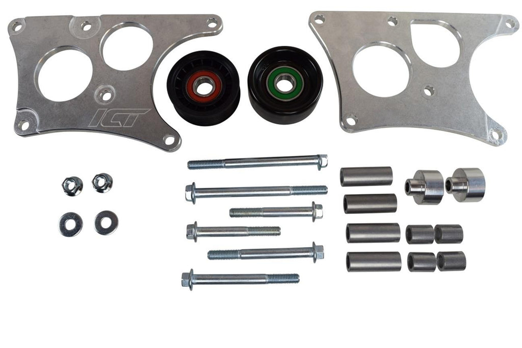 ICT Billet alternator brackets are made from aerospace-grade billet aluminum. They come packaged in kits that include alternator brackets, bolts, spacers, and all the necessary mounting hardware. They bolt to the face of the block and can only be used on blocks with at least two mounting holes on the front of the block.Brand: ICT Billet