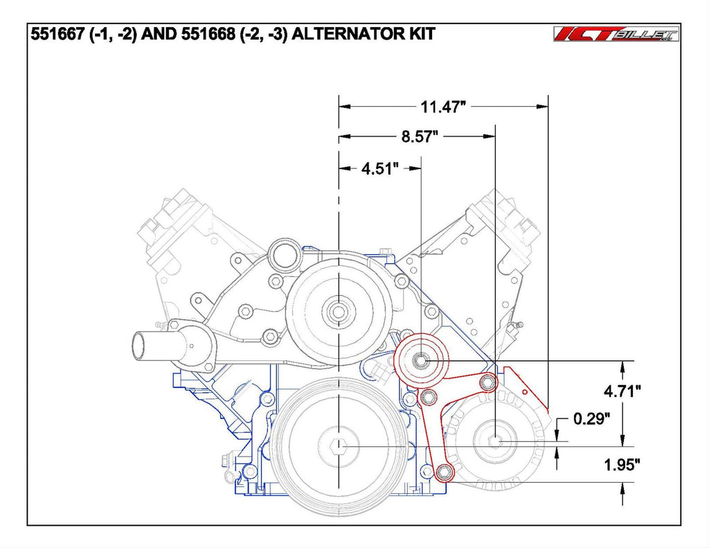 ICT Billet alternator brackets are made from aerospace-grade billet aluminum. They come packaged in kits that include alternator brackets, bolts, spacers, and all the necessary mounting hardware. They bolt to the face of the block and can only be used on blocks with at least two mounting holes on the front of the block.Brand: ICT Billet
