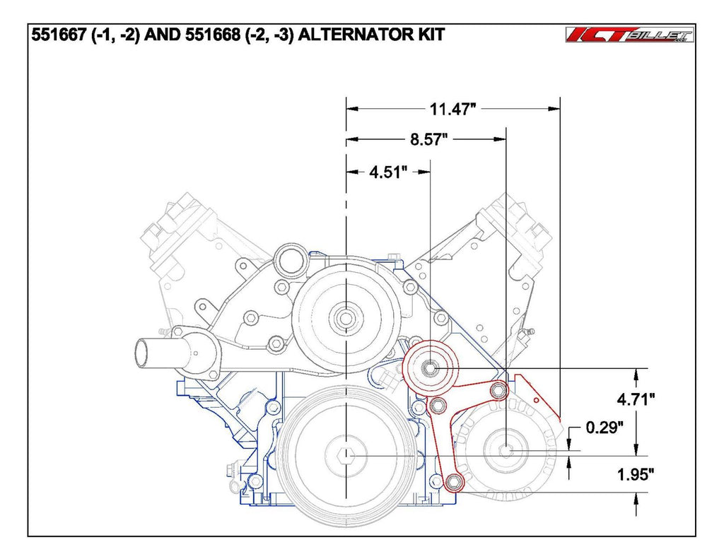 ICT Billet alternator brackets are made from aerospace-grade billet aluminum. They come packaged in kits that include alternator brackets, bolts, spacers, and all the necessary mounting hardware. They bolt to the face of the block and can only be used on blocks with at least two mounting holes on the front of the block.Brand: ICT Billet