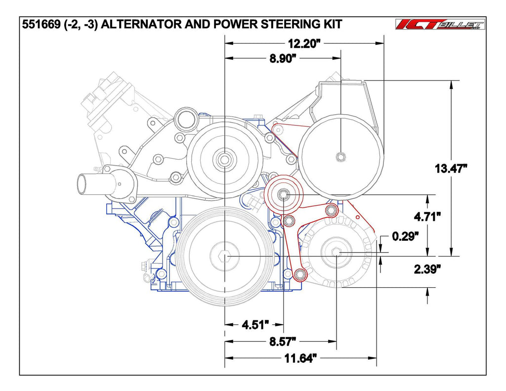 ICT Billet alternator brackets are made from aerospace-grade billet aluminum. They come packaged in kits that include alternator brackets, bolts, spacers, and all the necessary mounting hardware. They bolt to the face of the block and can only be used on blocks with at least two mounting holes on the front of the block.Brand: ICT Billet