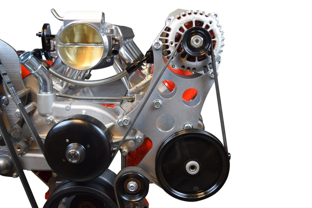 Notes: Kit uses LS1 Camaro crank pulley and includes accessory brackets, idler pulley, bolts, and spacers. Uses corvette 97-04 power steering pump and pulley. Will fit alternators from any LS engine and 97 Silverado with 5.7L except Corvette. 145 and 160 AMP truck alternators require approximately 3/4" longer belt.