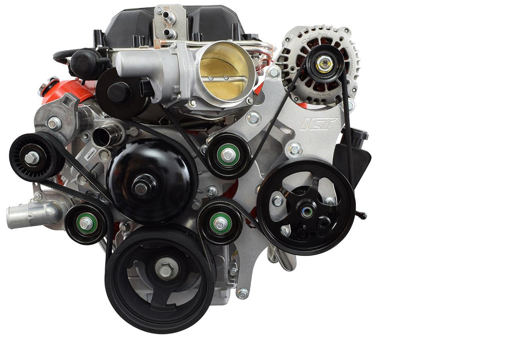 Notes: Designed for clearance on LSA superchargers. Fits truck/2010+ Camaro pulley spacing. Requires truck power steering pump and alternator.