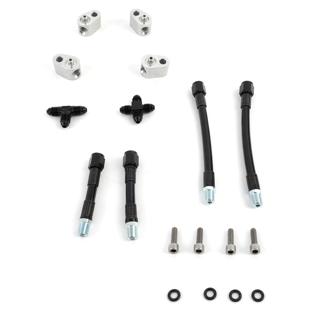 Notes: Provides steam vents for front location only. Use steam tube block-off plugs for rear holes. May require modification to water pump or radiator to attach outlet hose. Includes swivels fittings, bolts and compression fitting for stainless braided hose.