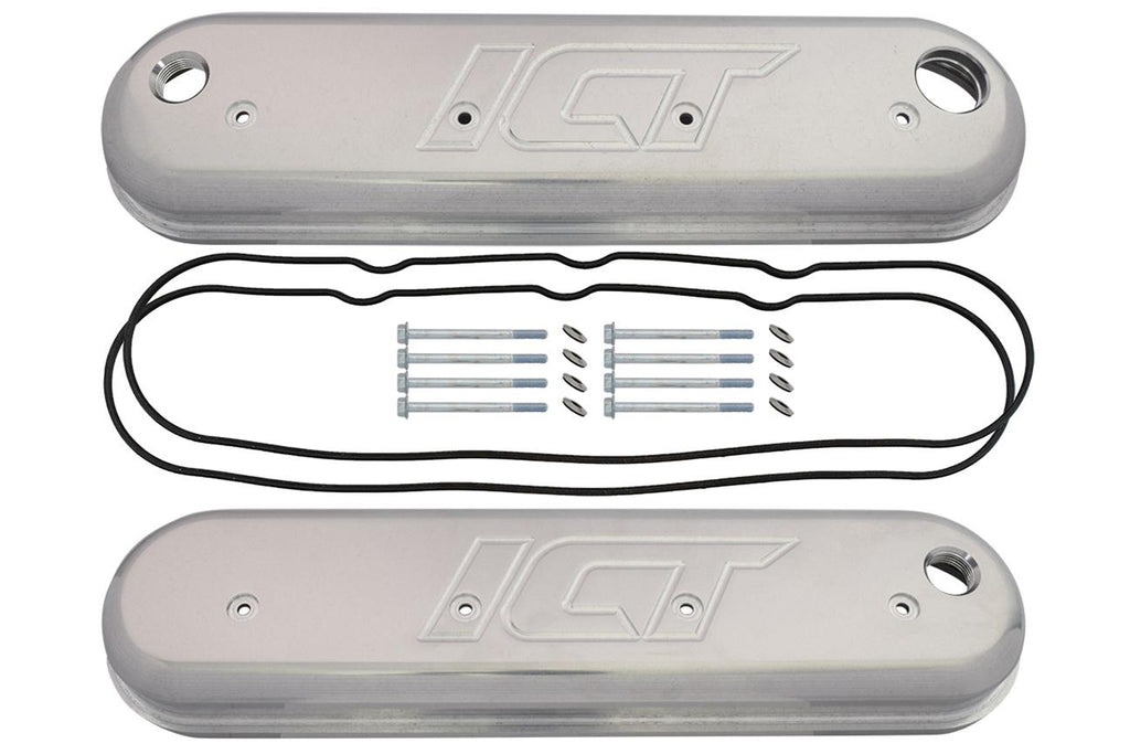 ICT Billet offers LS billet valve cover sets for GM LS Series engines spanning two decades. They're crafted from aerospace-grade aluminum—and include two billet valve covers, gaskets, and mounting hardware. The taller cover will accommodate most aftermarket roller rockers. These covers feature -12 AN ORB PVC ports and fit all factory oil caps (single-tooth style cap). Upgrade your valve covers with beautiful billet!Brand: ICT Billet