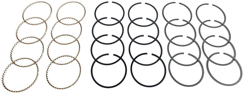 Notes: Barrel face D-wall torsional top ring, taper face D-wall reverse torsional second ring with full seal flex vent style oil ring.