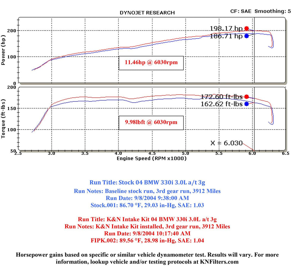 The K&N 57-1001 FIPK air intake system replaces the restrictive factory air filter and air intake housing in some BMW 330 models. K&N intakes are designed to dramatically reduce intake restriction as they smooth and straighten air flow. This allows your BMW’s engine to inhale a larger amount of air than the factory air filter assembly. More air means more usable power and acceleration throughout the engine’s RPM range. The 57-1001 air intake comes with a chrome topped K&N high-flow air filter and a heat shield that installs into the previous air box space. Air is directed past the mass air sensor and through an aerodynamically engineered intake tube into the engine’s throttle body for a guaranteed power gain. The tube accommodates the factory vent hose. The oversized conical air filter can be used for up to 100,000 miles before servicing is needed depending on driving conditions. This air intake is relatively easy to install usually in 90 minutes or less using the existing factory mounting points. The tools needed are a screwdriver, socket set and a couple of wrenches. K&N 57 Series FIPK's are street legal in all 50 US states and come with K&N's Million Mile Limited Warranty.