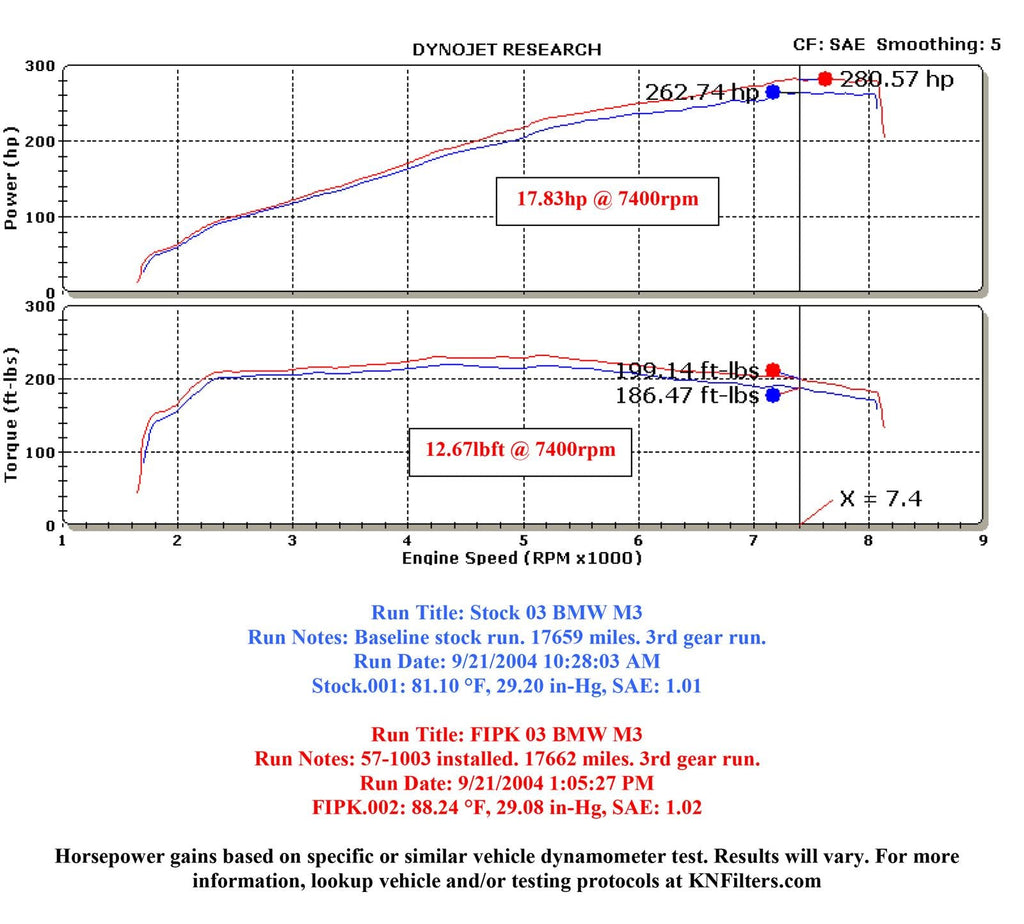 The K&N 57-1003 FIPK air intake system replaces the restrictive factory air filter and air intake housing in some BMW M3 models. K&N intakes are designed to dramatically reduce intake restriction as they smooth and straighten air flow. This allows your M3’s engine to inhale a larger amount of air than the factory air filter assembly. More air means more usable power and acceleration throughout the engine’s RPM range. The 57-1003 air intake comes with a chrome topped K&N high-flow air filter and a heat shield that installs into the previous air box space. Air is directed through an aerodynamically engineered intake tube into the engine’s throttle body for a guaranteed power gain. The tube accommodates the factory mass air sensor. The oversized cone shaped air filter can be used for up to 100,000 miles before servicing is needed depending on driving conditions. This air intake is relatively easy to install usually in 90 minutes or less using the existing factory mounting points. The tools needed are a screwdriver, socket set and an Allen wrench. K&N 57 Series FIPK's are street legal in all 50 US states and come with K&N's Million Mile Limited Warranty.